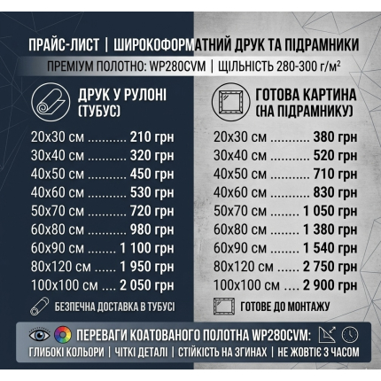 • Полотно WP280CVM: Використовуємо високоякісний матовий коатований холст щільністю 280-300 г/м². Матеріал забезпечує глибоку передачу кольорів, чіткість деталей та стійкість до розтріскування на згинах при натяжці. Не жовтіє з часом.